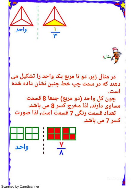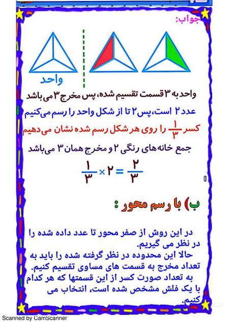 دو طرف این مربع را تا میزنیم که بصورت مثلث جمع شود و بازش میکنیم و دولا میکنیم، دوباره تا میزنیم و باز میکنیم که به شکل چهار تا مثلث درآید. میتوانیم این چهار مثلث را برگردانیم . مثلاً یکی از این مثلثها را برگردانیم و از دانشآموز میپرسیم چه قسمت از شکل رنگی است؟ او پاسخ میدهد یک قسمت و باز سؤال میکنیم چند تا مثلث داریم ؟